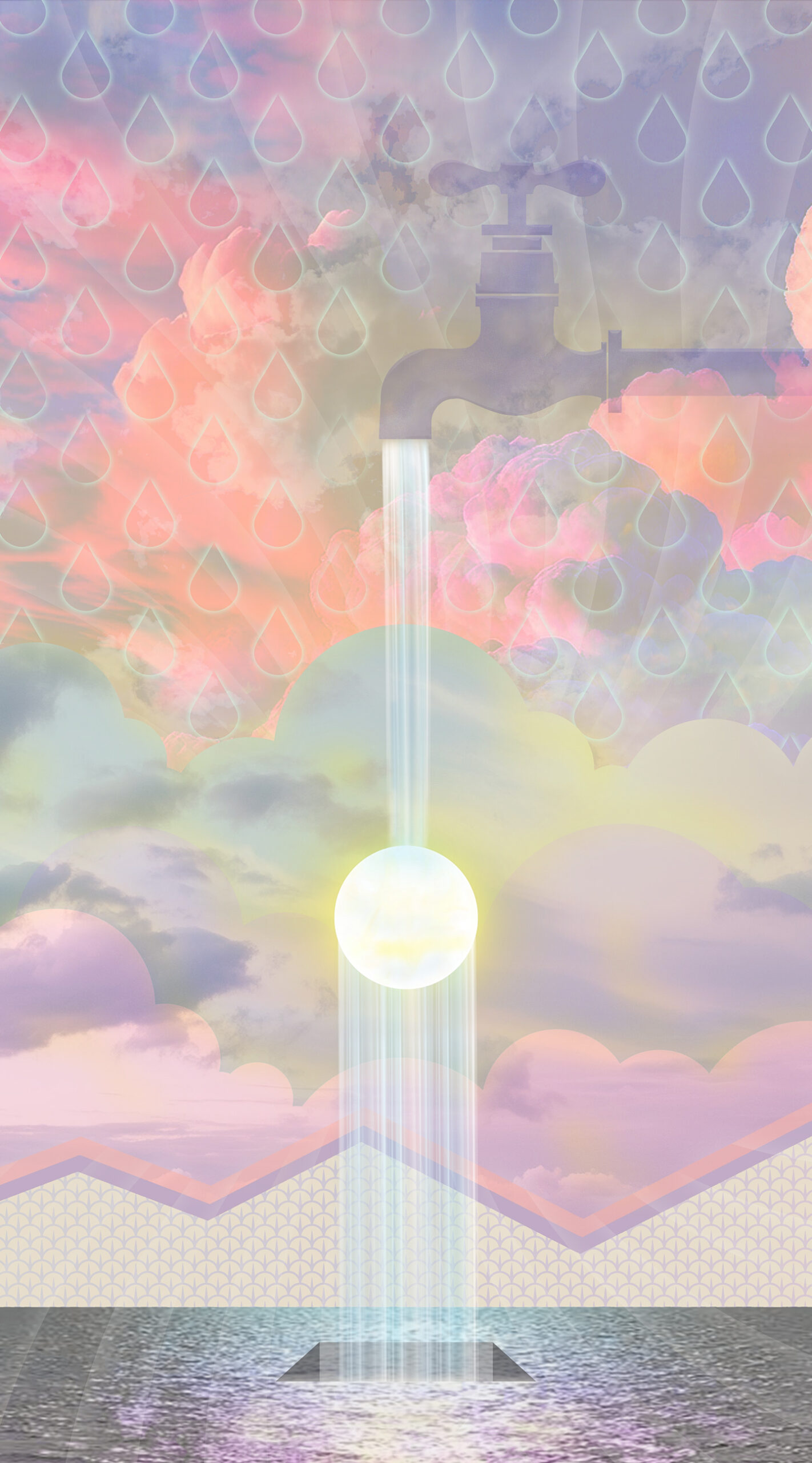 This work centers on the idea of constant flow, where a source above releases light and energy downward into the world below. The faucet becomes a symbol of access, suggesting that what we receive is not random but part of a continuous, unseen channel.