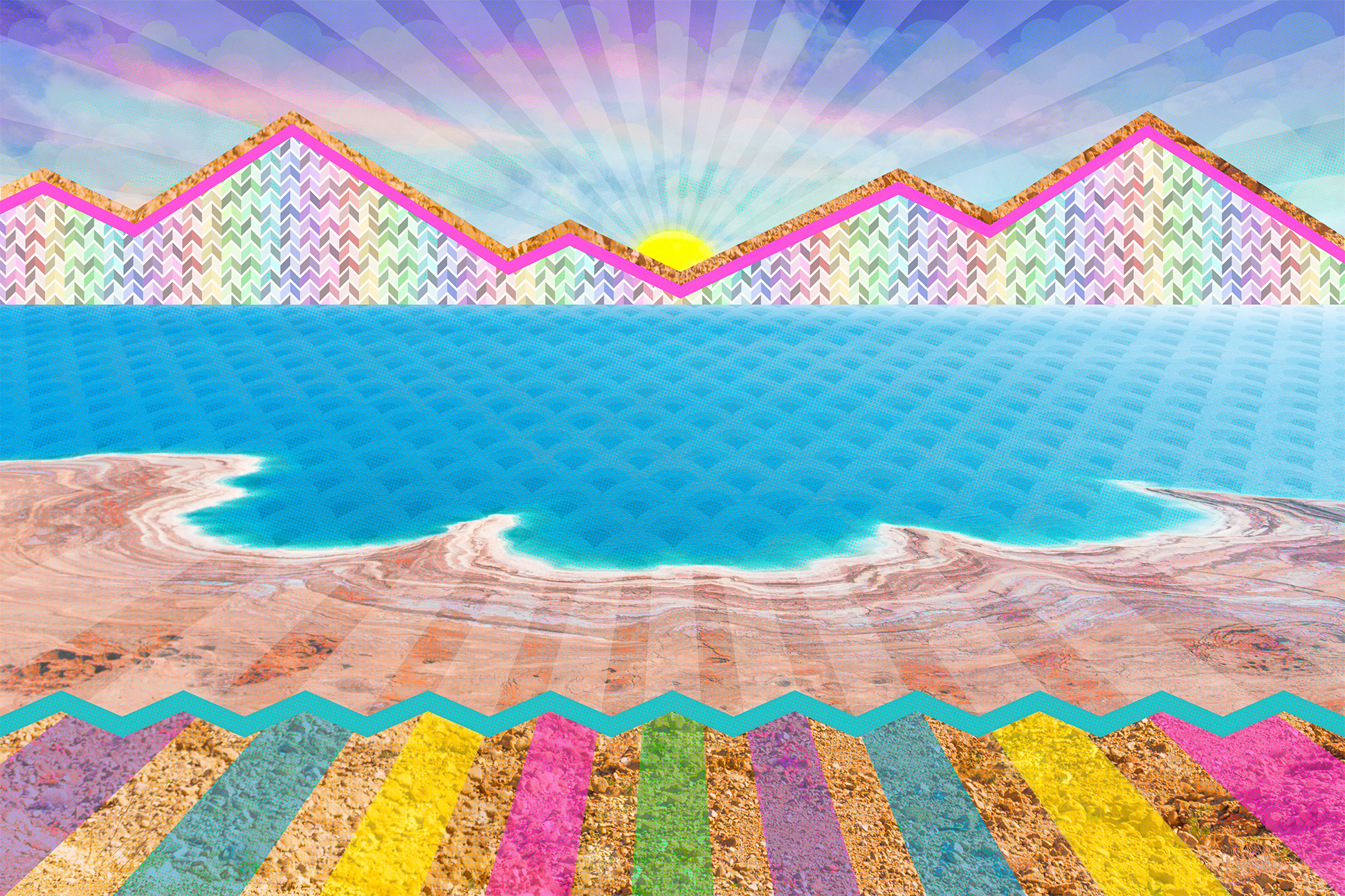 Color moves in broad bands across land and water, charging the horizon with rhythm and energy. The scene feels alive and unsettled in a good way, where brightness hums against stillness and the edge between elements becomes electric.