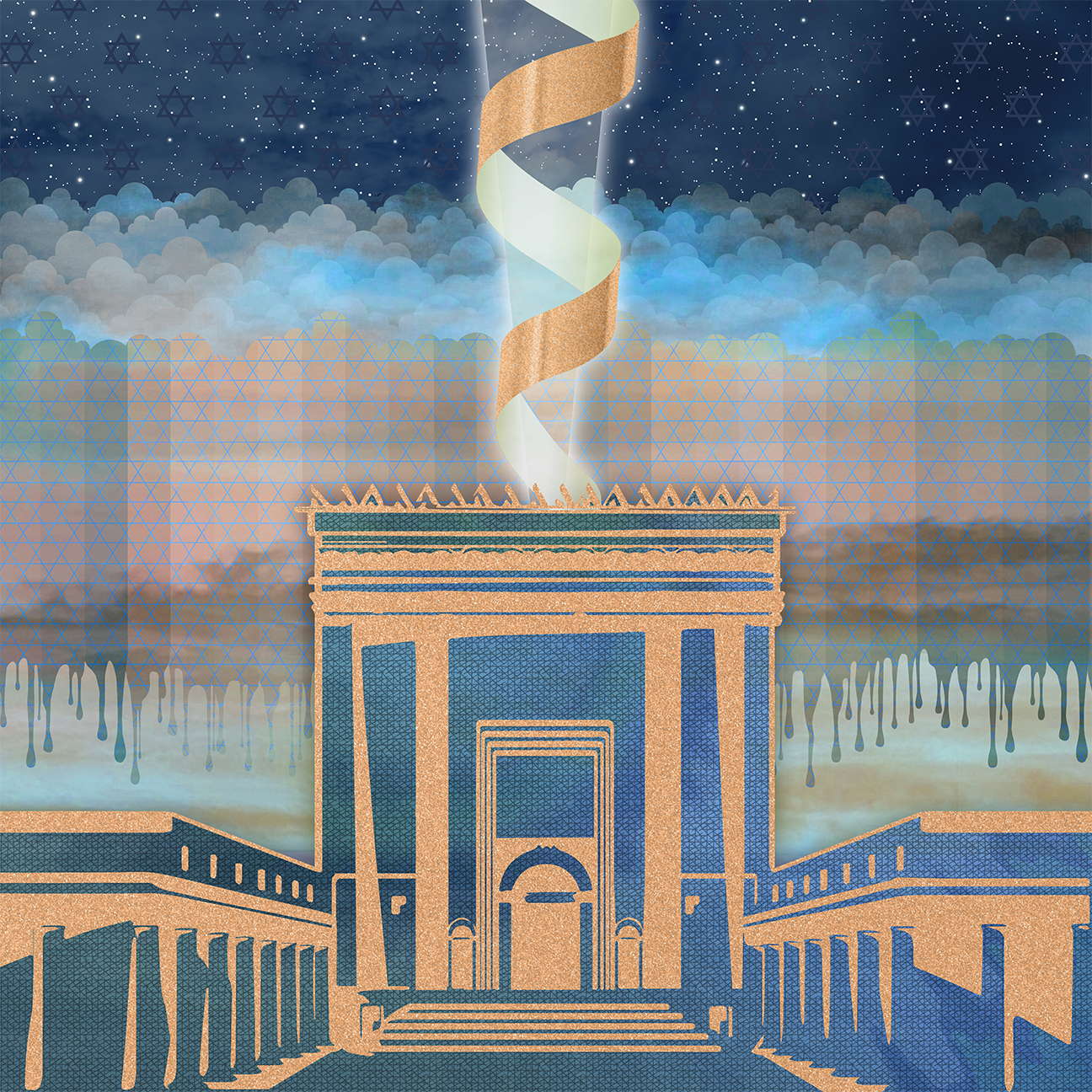 This work presents the Beit HaMikdash as a living structure rather than a ruin or memory. Rising through layers of sky, color, and light, the form stands intact, centered, and open, suggesting continuity rather than loss.
