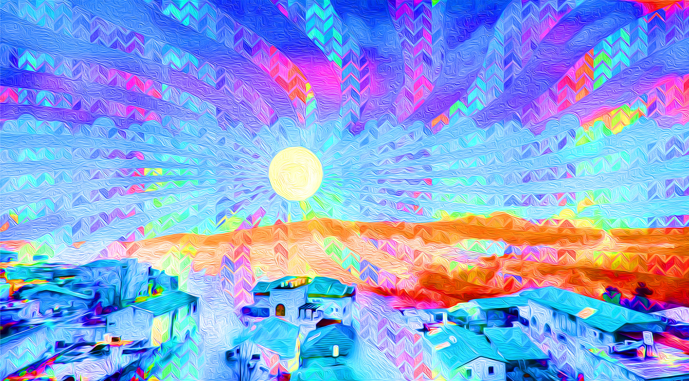“Tsfat on Acid” reimagines the mystical city through an acidic, high-vibrancy color palette, a term in art describing intense neon saturation and chromatic energy. The bold colors illuminate mountains, rooftops, and sky with heightened brilliance, capturing the spiritual vitality and charged atmosphere for which Tzfat is renowned.